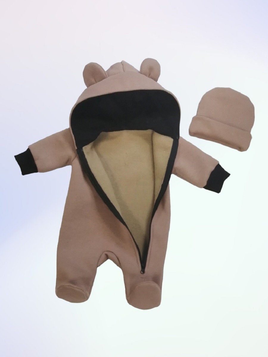 "МоёДитё" комбинезон выполнен из футера с начёсом. Комбинезон с капюшоном на подкладке и декорирован сверху ушками, с закрытыми ножками, рукава на манжетах, спереди косая молния до конца одной ножки. Шапочка из кашкорсе можно одевать как с отворотом, так и без. Очень хорошо тянется.